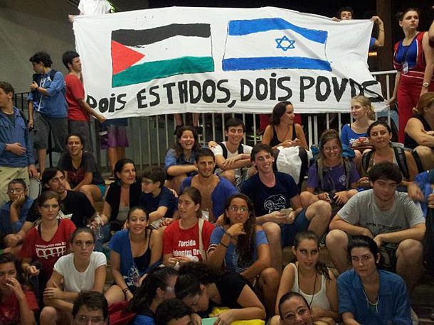 Faz pouco tempo,um fato criado por movimentos juvenis judaicos lançou confusão no Festival de Dança Israeli da Hebraica-RJ. Entrando no local do evento sem despertar suspeitas, jovens do movimento sionista de esquerda, Hashomer Hatzair, estenderam nas arquibancadas do ginásio do clube das Laranjeiras, uma faixa onde havia uma bandeira da Palestina e uma bandeira de Israel, com os dizeres: "Dois Estados para Dois Povos". Uma grande parcela do público presente à Hebraica reagiu e sentiu-se ofendida. Dizem as más línguas que pressionado, o presidente da Hebraica entrou em campo e tratou de convencer os jovens de camisas azuis a removerem a faixa definindo que ela poderia ser estendida nos pilotis, "quando o festival terminasse". A garotada do Hashomer estendeu a faixa logo que pôde alegando que o presidente do clube havia permitido. Os ânimos se acirraram e por pouco a situação não degenerou em pancadaria. Juntaram-se aos do Hashomer, jovens do Dror gritando palavras de ordem. Basicamente, gritavam que "a manifestação em contrário às ideias deles era contra o direito de expressão!" Em outra recente manifestação, jovens do mesmo Dror empunhavam um cartaz com os seguintes dizeres: "Palestinos Merecem um Estado".Você, leitor, já imaginou algum grupo de jovens do Hamas, do Hezbollah ou da Jihad Islâmica carregando bandeiras de Israel e pedindo o reconhecimento do Estado Judeu pelos vinte e dois países muçulmanos do norte da África e do Oriente Médio? Se não imaginou, nem perca seu tempo. Idiotas só mesmo existem entre nós. Agora, para que não reste qualquer dúvida, vale lembrar que não há estado palestino independente porque a liderança palestina não tomou a atitude que precisa tomar. É uma questão de vontade política. Mais fácil fica culpar Israel. (Foto do Facebook do Shomer e da organização da manifedstação em Copacabana)